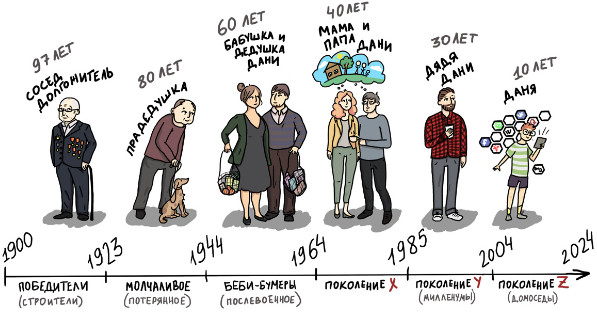 Чтобы не запутаться в названиях поколений, познакомим вас с 10-летним Даниилом (на иллюстрации выше — справа). Он представитель нового поколения Z, которое пока формируется. Для примера мы использовали средний возраст представителей поколений. Дяде Даниила 30 лет, родителям — 40, бабушке и дедушке — 60, прадедушке — 80, а соседу-долгожителю, с которым Даниил часто общается, — 97 лет.