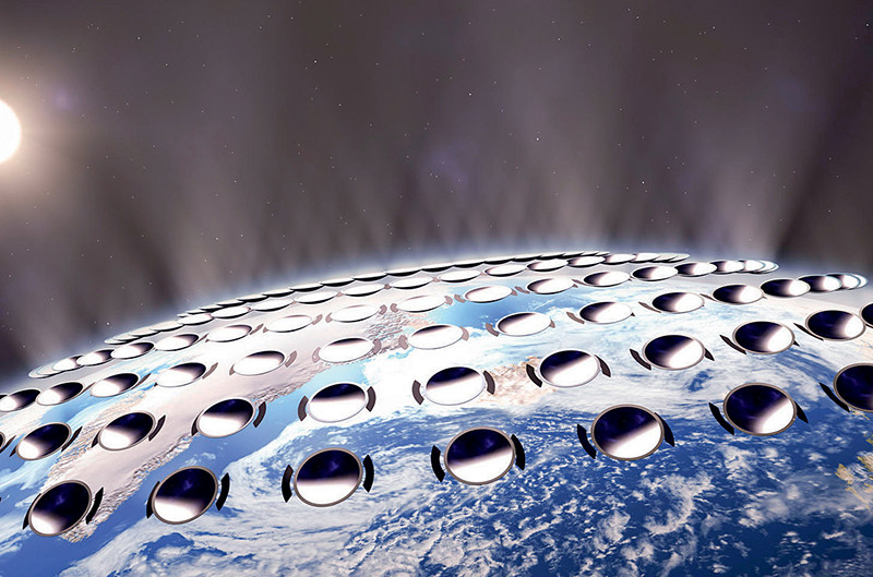 Самый надежный способ замедлить нагревание планеты – уменьшить приток энергии, которую она получает от Солнца, экранировав часть этого излучения. Еще в начале 2000-х годов Лоуэлл Вуд из Ливерморской национальной лаборатории подсчитал, что для этого на околоземную орбиту понадобится вывести зеркало общей площадью около 1,5 млн кв. км – три четверти Гренландии. Роджер Энджел из Аризонского университета предложил технически менее сложный вариант – массив из множества космических зеркал меньшего размера, «подвешенных» в точке L1 системы Земля – Солнце. Здесь гравитации обоих тел уравновешивают друг друга, и объекты могут оставаться на месте без постоянного расхода топлива.