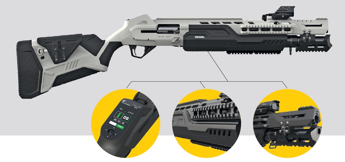 Внутри Ultima классический безотказный газоотводный автомат MP-155 второго калибра, который может поставляться с трубчатым магазином на четыре или шесть патронов плюс один в патроннике. Если подержать в руках Ultima и MP-155, то первая кажется ощутимее тяжелее. «Понятно почему – мы его обвешиваем разным оборудованием, – поясняет Власенко, – основной дополнительный вес приходится на "бивень" у среза ствола, который почти исключительно для дизайна. Но если нужно, им можно расколоть стекло. Он пришел как раз из компьютерных шутеров, где таким бивнем и раскалывают преграды».