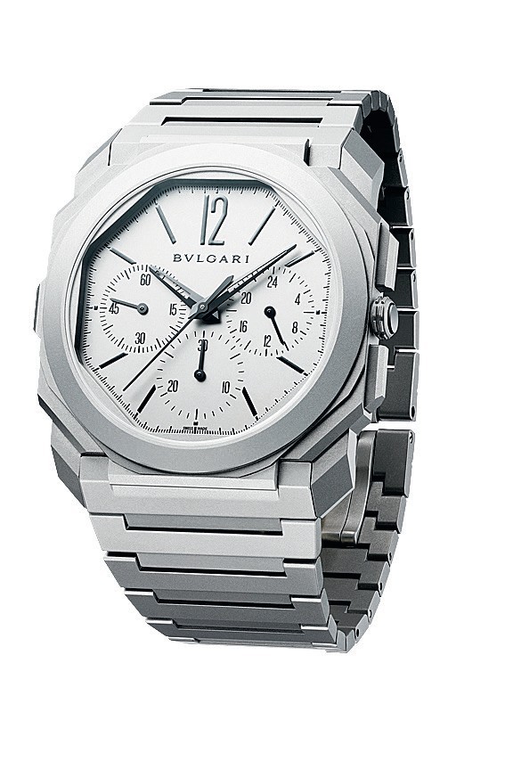 Кстати, новейший рекорд застолбил за собой дом Bvlgari. До этого ему принадлежало четыре высших достижения: самые тонкие автоматические часы, самые тонкие турбийоны как с ручным, так и с автоматическим заводом, тончайший минутный репетир, а в этом году он установил пятый, представив самый стройный автоматический хронограф. Модель Bvlgari Octo Finissimo Chronograph GMT Automatic не только представляет собой хронограф, но также имеет модуль индикатора времени во втором часовом поясе (дополнительный 24-часовой циферблат в положении «3 часа» управляется боковой кнопкой у отметки «9 часов»). Высота механизма BVL 318 составляет всего лишь 3,3 мм, зато при всей своей стройности он выдает 55-часовой запас хода. Титановый корпус диаметром 42 мм имеет высоту 6,9 мм. Задняя крышка – сапфировая, титановая заводная головка декорирована керамической вставкой.