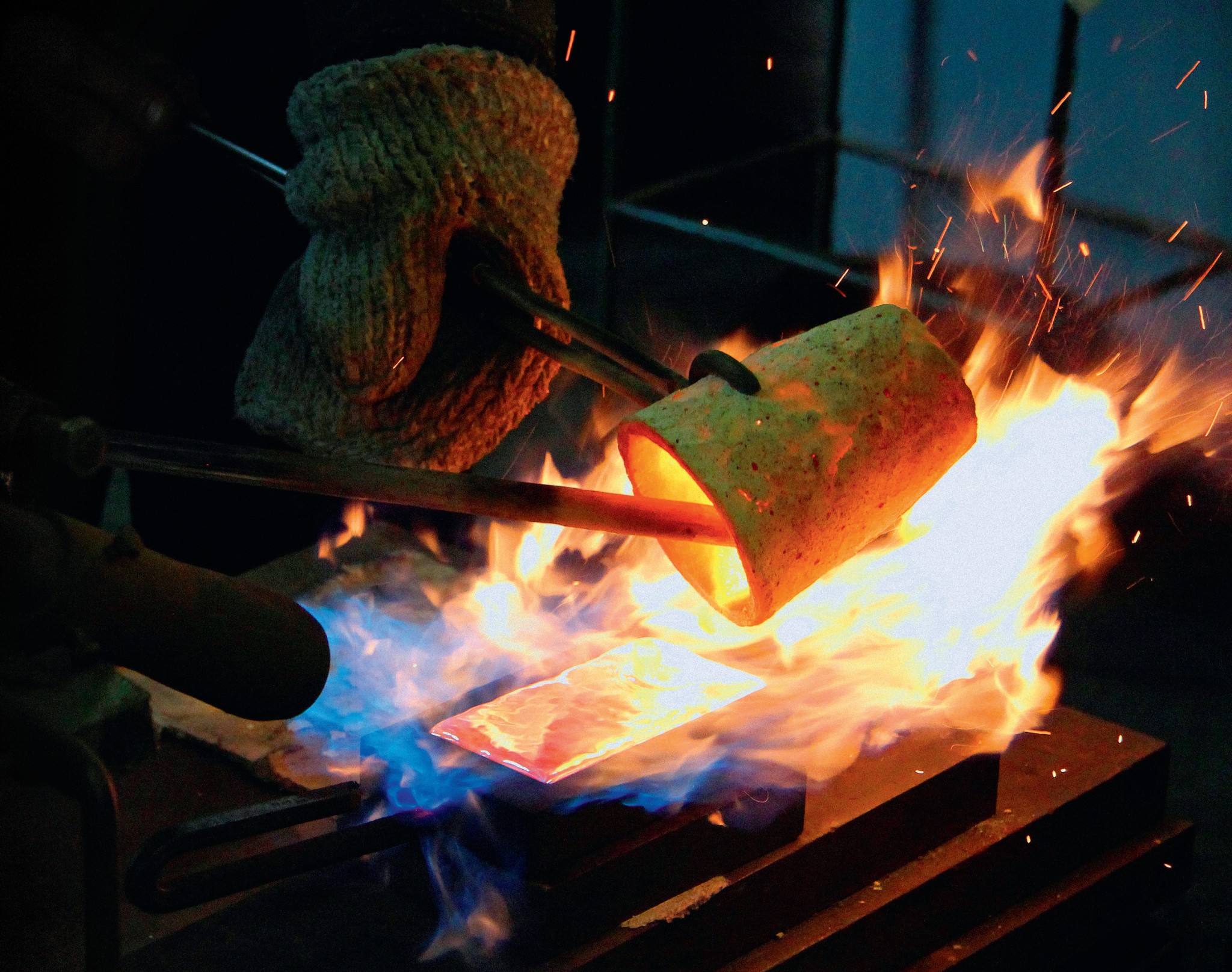 Шлих – обогащенное сырье – уже содержит большой процент золота и выглядит как крупнозернистый порошок грязно-желтого цвета. Именно в таком виде он поступает на ЕЗ ОЦМ и, прежде чем превратиться в золото наивысшей пробы, проходит целую технологическую цепочку. Ее начало нам довелось увидеть в плавильном цехе. В индукционную печь мастер ставит тигель со шлиховым золотом. По мере нагрева порошок медленно оседает, как будто плавится сахар или ледяная крошка. Наконец тают последние крупинки, и в тигле бурлит расплав. Так проходит приемная плавка: небольшая партия (на заводе говорят «место») шлиха поступила на завод от старательской артели. Задача первой плавки заключается в том, чтобы оценить химический состав сырья и выбрать оптимальную схему выделения из него чистого золота. Плавильщик Евгений Ветошкин берет длинную трубку из кварцевого стекла с черной резиновой грушей на конце и опускает другой конец прямо в расплав. Благодаря созданному грушей разрежению часть металла всасывается в трубку, где и застывает. Потом кончик трубки разбивается, и из него выпадает металлический стержень – проба. «Отобрать представительную пробу от застывшего слитка довольно сложно, так как из-за большого количества примесей основной определяемый компонент, в нашем случае золото, не будет равномерно распределен