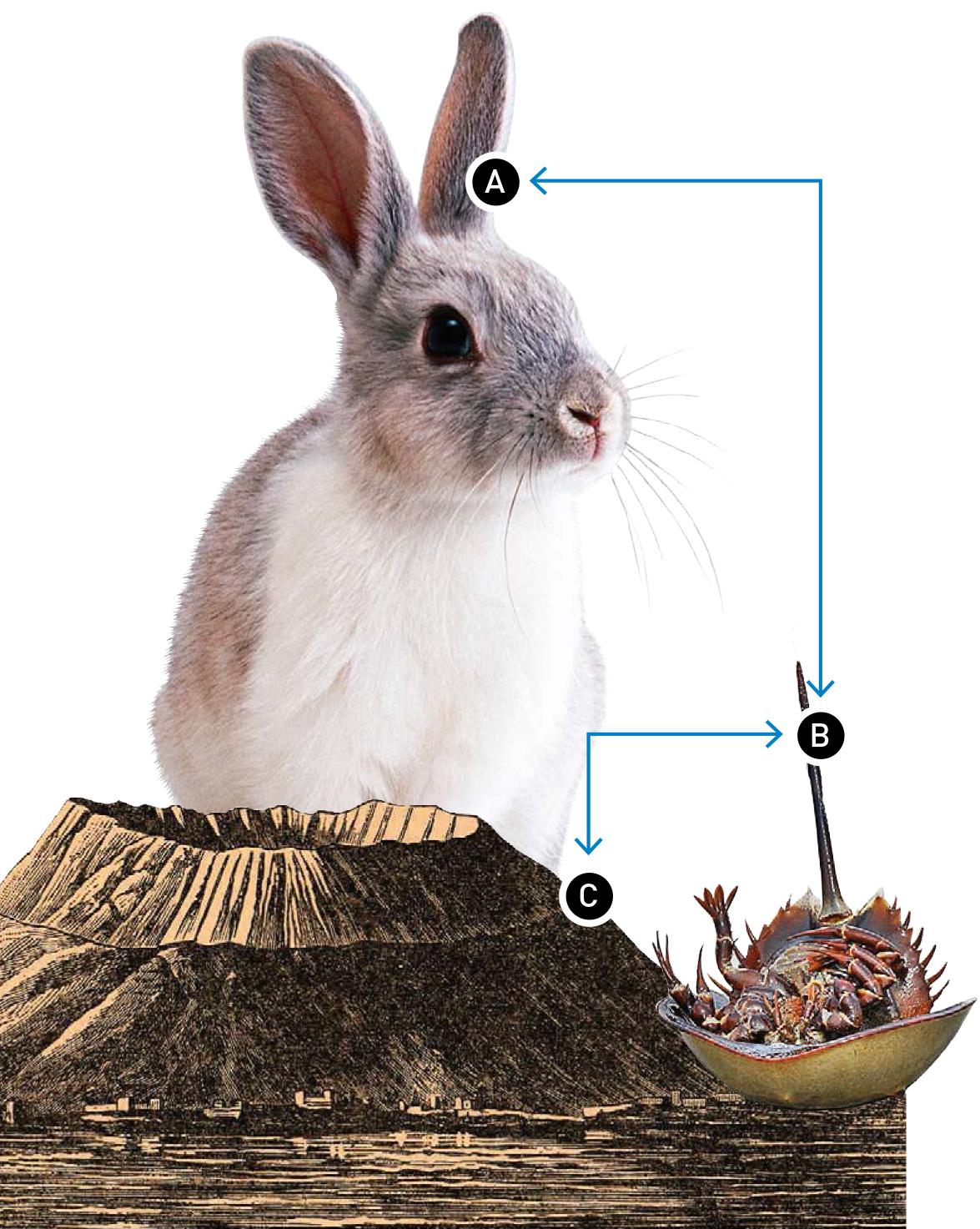 Долгое время кролики [А] оставались одними из главных и недооцененных героев медицины. Реакция этих животных на эндотоксины сходна с нашей, поэтому для испытаний чистоты медицинских препаратов их инъецировали кроликам в ушную вену и следили, не вызовет ли это повышения температуры. Страшно представить, сколько животных было использовано для таких пирогенных проб, но в последнее время эту процедуру быстро вытесняет сравнительно гуманный метод. Число его «жертв» можно оценить достаточно точно: ежегодно для этого из моря вылавливают около 500 тыс. членистоногих мечехвостов [В], у которых забирают