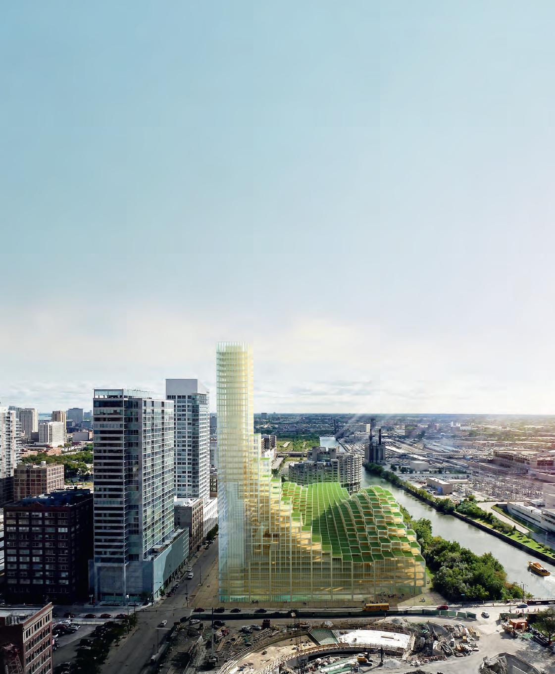 CLT-плиту формируют из высушенных досок толщиной от 16 до 50 мм и более. Их соединяют шипами в плоские панели и складывают «бутербродом» из трех-семи слоев, волокна которых ориентированы перпендикулярно друг другу. При этом обычно направление внешних слоев выбирают так, чтобы их волокна шли вертикально, повышая жесткость всей структуры. Деревянные слои спрессовывают с полиуретановыми, феноловыми или меламиновыми клеями – и, наконец, шлифуют. Из таких панелей в 2009 году в Лондоне по проекту бюро Waugh Thistleton Architects был возведен 9-этажный жилой дом Murray Grove. И 18-этажное общежитие в Канаде – лишь очередной шаг в стремлении деревянных зданий вверх. Уже в следующем году в Амстердаме построят 21-этажное жилое здание из CLT-панелей, а в 2023-м в Стокгольме по проекту DinellJohnasson будет возведен дом в 34 этажа. Башня River Beach в Чикаго (конструкция которой будет все-таки укреплена диагональными стальными балками) поднимется