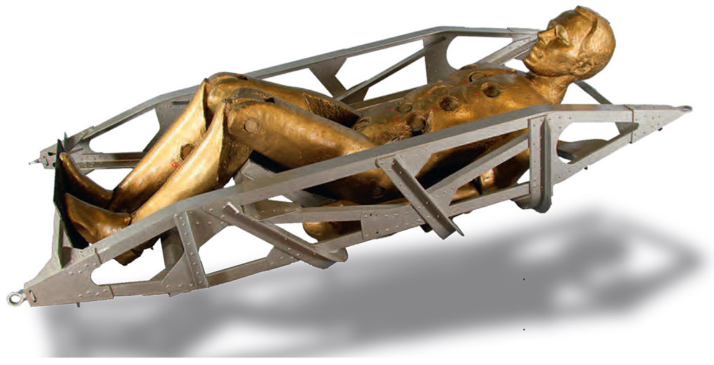Выставка «Космонавты: рождение космической эры», прошедшая в прошлом году в Лондонском музее науки, произвела фурор – некоторые раритеты советской космонавтики специально для нее подверглись сложной процедуре рассекречивания. В последнем зале, освещенный синеватым светом, стоял единственный предмет – полулежащая в металлических «салазках» золотистая фигура человека. В отличие от экспонатов,