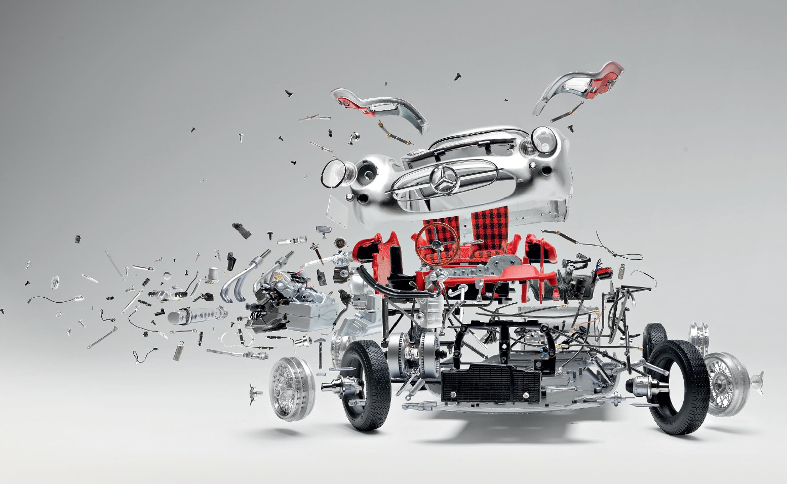 Фабиан отмечает каждую деталь на карандашном наброске: это помогает не запутаться в сотнях мелких частей. Чтобы на готовом изображении детали находились на нужном расстоянии друг от друга, «летели» в нужных направлениях, художник крепит их на тонких проволочках, которые втыкает в кусочки пенопласта. «Их создание потребовало так много времени, а результат выглядит как снимок, сделанный высокоскоростной камерой. Только на то, чтобы разобрать каждую модель, у меня ушло по рабочему дню, потому что они очень детальные, очень близки к оригиналу. На каждом снимке – больше тысячи деталей. Но в этой части работы я нахожу большое удовольствие, в этом есть что-то детское, мальчишеское – разборка, слой за слоем. Что действительно раздражает, так это работа с камерой: выставить штатив, свет, объектив – и все равно красивые снимки получаются не каждый раз». Первые три работы имели успех, и Фабиан продолжил серию, разобрав еще пять моделей винтажных автомобилей: Audi Auto Union Type C (1936–1937), Maserati 250F