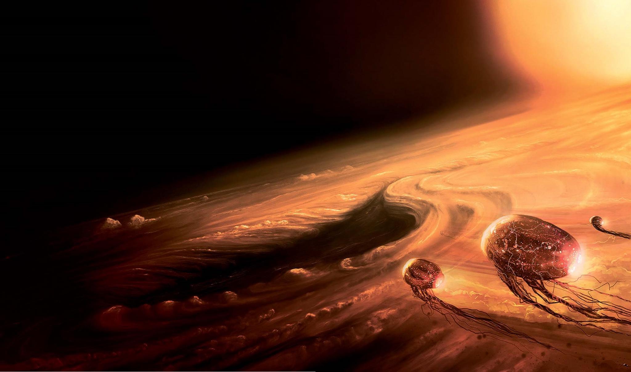 Наша голубая, зеленая планета подходит для нас замечательно, но жизнь может не нуждаться ни в лесах и океанах, ни в кислороде, ни даже в твердой поверхности. В кубометре воздуха на высоте 10 км содержатся тысячи бактериальных клеток, и многие из них не просто выживают, но и метаболизируют. Еще в конце 1960-х астрофизик и популяризатор астрономии Карл Саган описал воздушных существ, которые теоретически могли бы обитать в сравнительно спокойных верхних слоях плотной и горячей атмосферы Венеры, а позднее – и возможную жизнь на газовом гиганте вроде Юпитера. Ученый обозначил главные контуры юпитерианских экосистем, начиная с фотосинтезирующих организмов и заканчивая хищниками и даже «экстремофилами», населяющими самые неблагоприятные ниши.