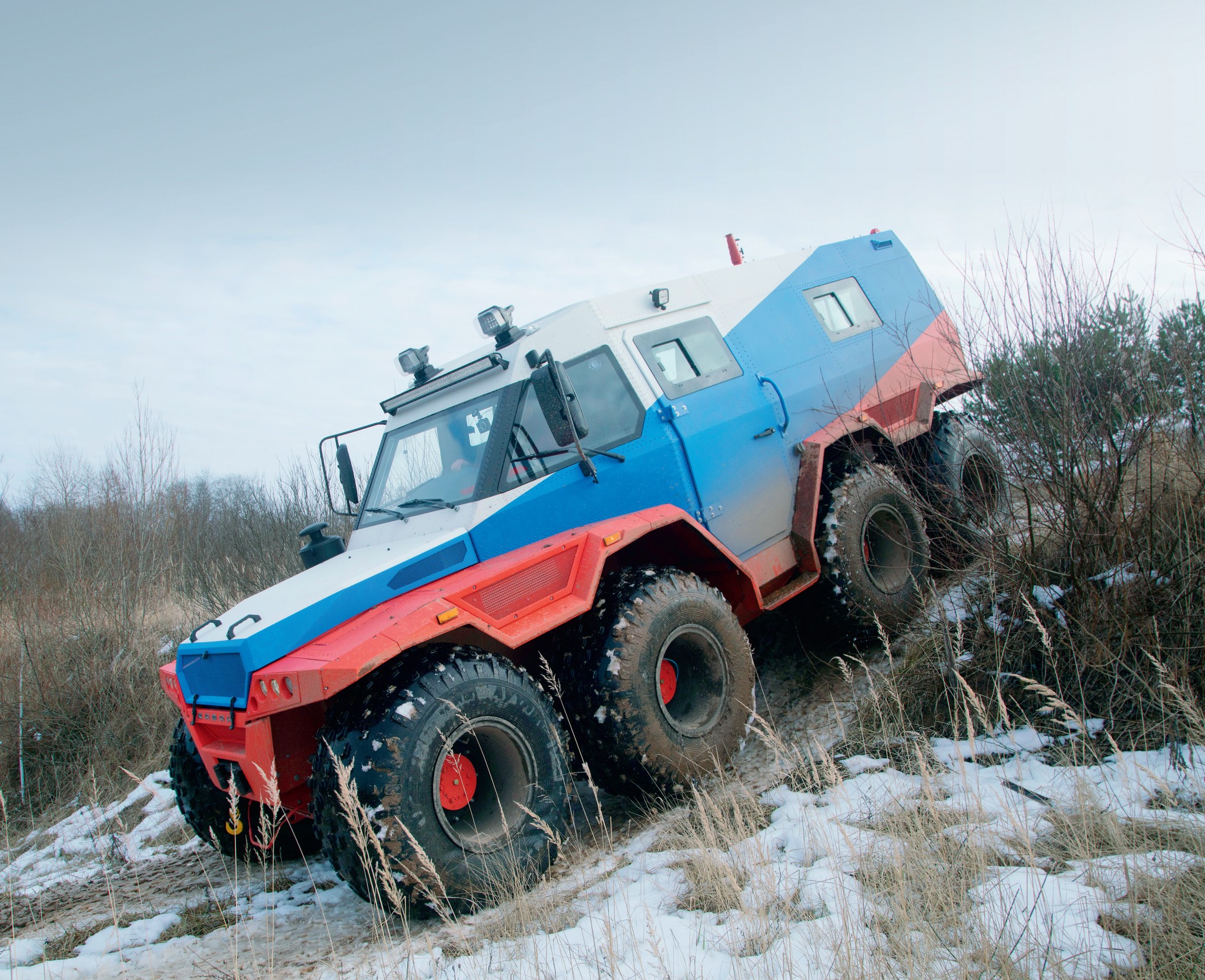 Это не внедорожник, не грузовик и не трактор, хотя для его управления нужно водительское удостоверение тракториста-машиниста. Это плавающий колесный вездеход с комфортной подвеской и не менее комфортным салоном. Под его капотом установлен турбодизель Iveco F1C с цепным приводом ГРМ объемом 3 л и мощностью 146 л. с. Этот движок зарекомендовал себя как простой и надежный агрегат, но в ближайшее время вездеход получит новый мотор, заточенный под «Евро-6».