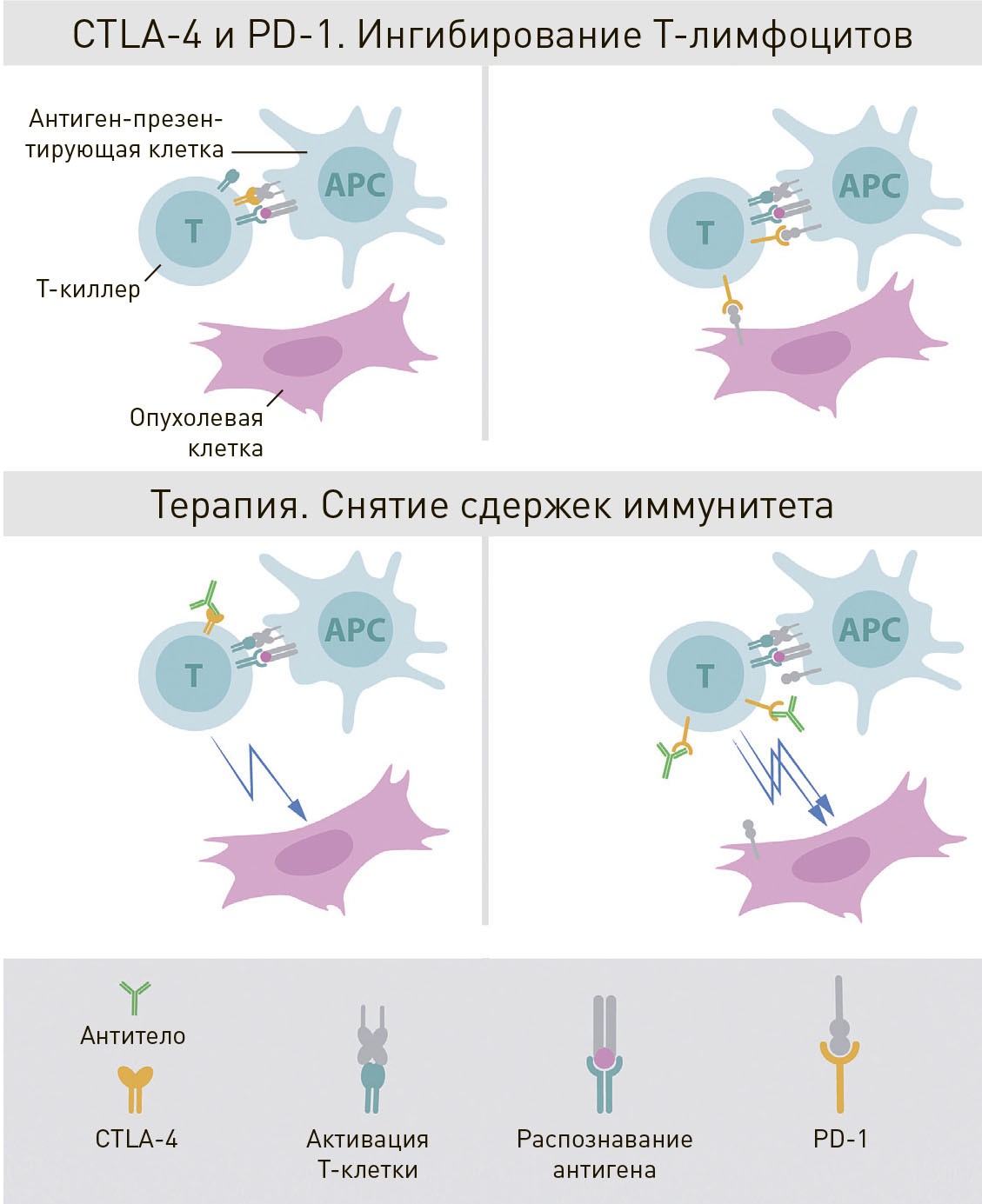 В зависимости от обстоятельств (и просто от случая) дендритная клетка может связаться с тем или иным регуляторным белком на поверхности распознавшего ее Т-лимфоцита. Одни из них запускают активацию киллера, другие подавляют ее, защищая организм от развития аутоиммунных реакций в ответ на обычные антигены здоровых клеток. Такими ингибиторами выступают, например, белки Т-лимфоцитов CTLA-4 и PD-1. Первый сдерживает излишнюю активность иммунитета на этапе взаимодействия Т-киллеров с дендритными клетками. А на PD-1 действуют молекулы, которые выделяют определенные виды опухолей, включая тормозной механизм лимфоцита и уходя из-под удара иммунной системы. Лекарства-ингибиторы чекпойнтов позволяют заблокировать возможности торможения лимфоцитов. Ипилимумаб связывается с CTLA-4, а одобренный в 2014 году ниволумаб действует против PD-1, помогая натравить на опухоль собственный иммунитет больного.
