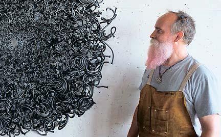Когда-то давно, еще учась в художественном колледже, Джон Бисби заглянул в старый заброшенный дом, чтобы подобрать объекты для своей будущей инсталляции, – и опрокинул ведро старых ржавых гвоздей. За годы они смялись в цельный металлический объект необычной и сложной формы. С тех пор художник почти забросил обычные инструменты: вооружившись пассатижами и молотками, сварочным аппаратом и кузнечным горном, он мастерит сложные скульптуры и инсталляции из гвоздей, тысяч одинаковых и разных, ржавых, черненых и еще совсем блестящих. В его палитре всего одна краска, но мастер находит в ней бесконечный потенциал.