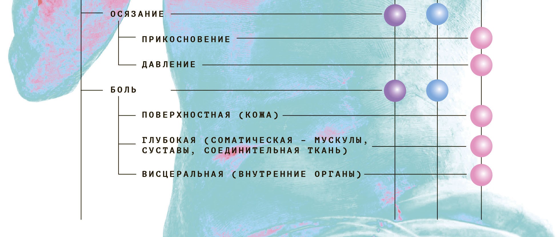 В самом деле, если Аристотель сопоставлял чувства соответствующим органам, то сегодня мы можем проделать то же на уровне рецепторов и нервных клеток. Взять хотя бы кожу и осязание. Различные осязательные стимулы воспринимаются совершенно разными клетками, и их сигналы движутся по своим нейронным путям. Терморецепторы воспринимают температуру; ноцицепторы – боль, сопровождающуюся повреждением окружающих тканей. Механорецепторы реагируют на прикосновение и давление, причем расположенные под поверхностью кожи тельца Пачини отличаются от барорецепторов в стенках сосудов, регистрирующих давление крови.