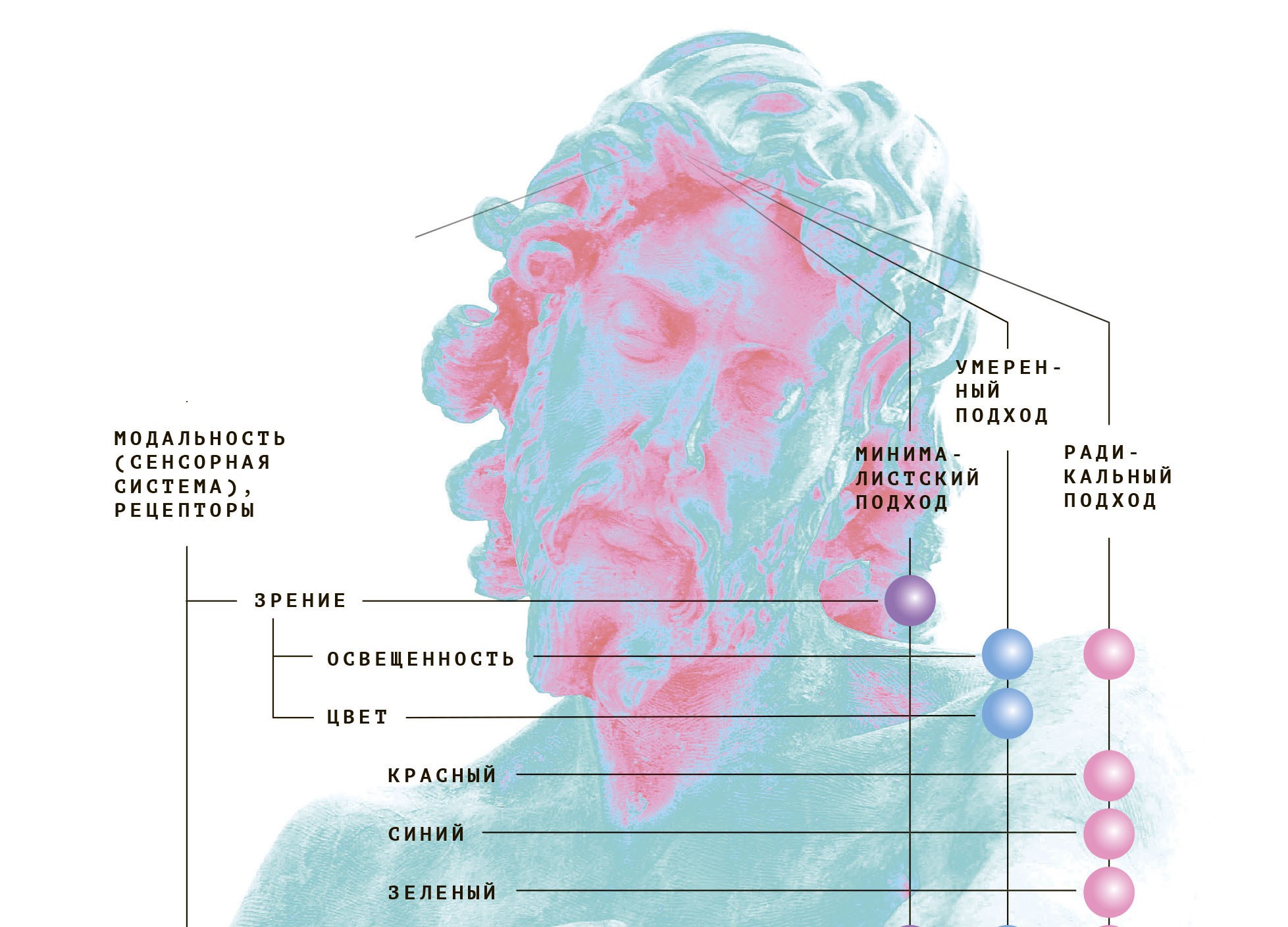 В наиболее крайних вариантах каждое из аристотелевых чувств можно разобрать по отдельным рецепторам. Палочки обеспечивают ночное «черно-белое» зрение, колбочки – различение цветов, причем они могут использовать один из трех видов светочувствительных пигментов, а у некоторых людей – и четыре. Различаются терморецепторы холода (TRPM8) и жары (TRPV1), вкусовые рецепторы – так что, по мнению некоторых ученых-радикалов, корректно говорить о разных видах зрения, вкуса и температурной чувствительности как о разных чувствах.