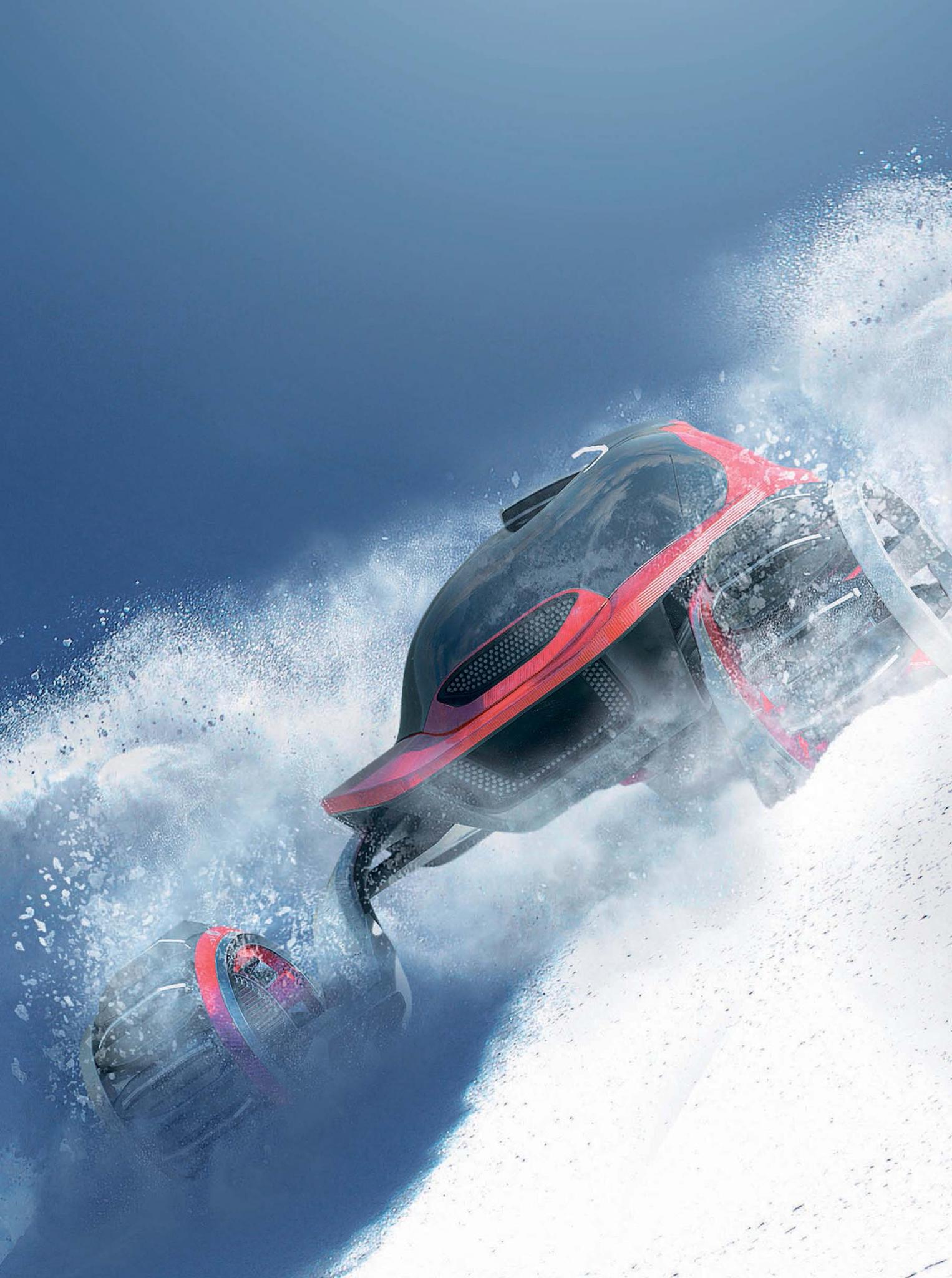Хуан Гарсия Мансилья, горнолыжник, дайвер и дизайнер из Буэнос-Айреса, нарисовал футуристический транспорт для стремительного передвижения по заснеженным горным склонам. Впереди – два ведущих колеса, сконструированных по бесступичной схеме. На каждом колесе по 12 лопастей двух видов – длинные и короткие. Если надо усилить сцепление с глубоким снегом, длинные выдвигаются наружу, а на твердой поверхности задвигаются в колесо. Сзади колес нет – подпружиненная стойка опирается на лыжу. Концепт Мансильи носит название RDSV – «снегоход быстрого реагирования».
