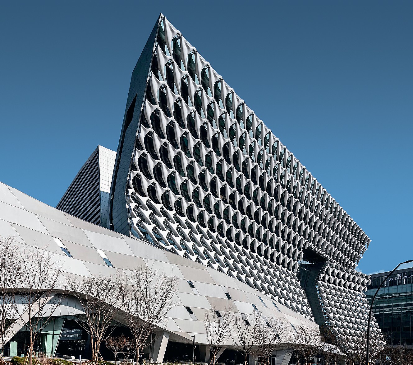 Прошли времена типовых промышленных и офисных зданий. Теперь в моде архитектурные высказывания, которые должны донести до широкой публики этическое и эстетическое кредо компании. В пригороде Сеула – районе Магок – власти решили организовать бизнес-парк с «индустриальной экосистемой». Что бы это ни значило, одним из первых резидентов новой площадки стал исследовательский и опытно-конструкторский центр южнокорейской компании Kolon. Название фирмы – сокращение от «корейский нейлон»: синтетические ткани и изделия из них – одно из главных направлений деятельности этого химического концерна. Здание центра спроектировано архитектурным бюро Morphosis, и, разумеется, в нем воплощены все современные экологические и энергосберегающие технологии. Весьма интересен один из фасадов: он не только внешне напоминает плетение ткани, но и выполнен из солнцезащитных элементов (бриссолей) с применением укрепляющей бетон ткани Heracron – фирменной продукции Kolon.