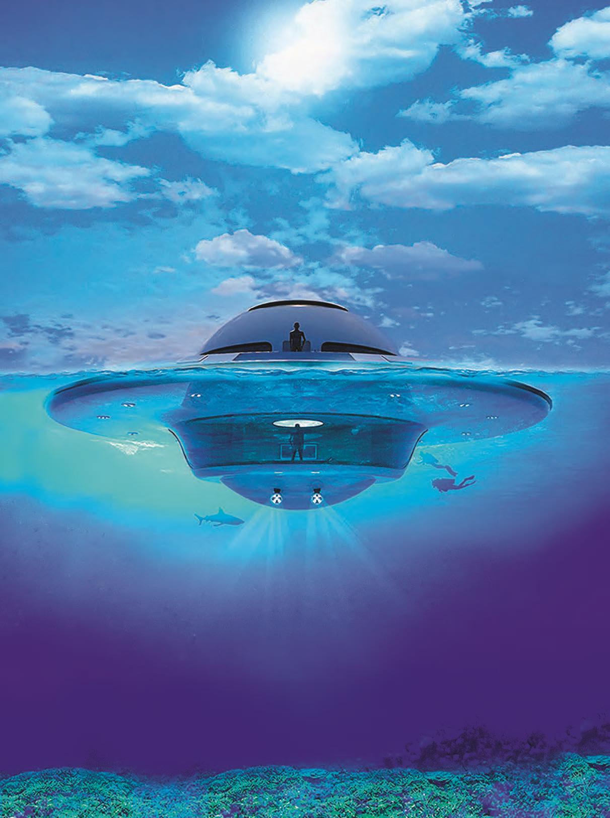 Дизайнеры из итальянской компании Jet Capsule, специализирующейся на разработке футуристических яхт, представили новую версию плавучего дома в форме летающей тарелки. Предыдущая модель дома-корабля, ожидаемо названного UFO (Unidentified Floating Object, то есть «Неопознанный плавающий объект»), поступила в продажу чуть более двух лет назад. Если всё пойдет по плану, UFO 2.0 можно будет приобрести в 2018 году. Авторы проекта считают, что UFO 2.0 идеально подходит для создания экологически чистых плавучих отелей. Дом сделан из полностью перерабатываемого стекловолокна, а в качестве источников энергии использует солнечные батареи и ветрогенератор. Общая площадь двух надводных и одного подводного уровней составляет 314 м2. Два электромотора мощностью 80 л.с. позволяют UFO 2.0 развивать скорость до 9 узлов (16,7 км/ч). Правда, плавать на большие расстояния на нем не предполагается – желающим сменить обстановку придется прибегнуть к помощи вертолета.