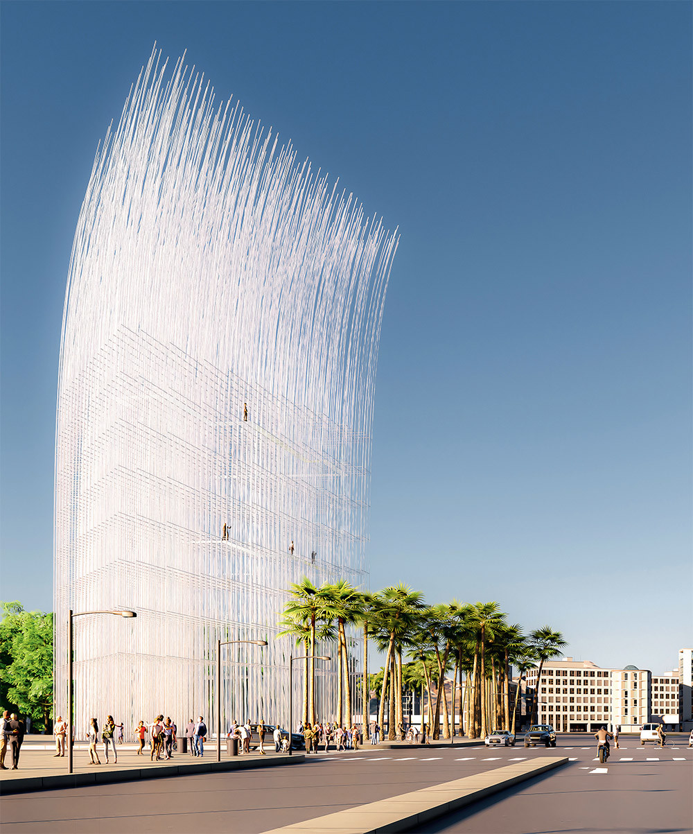 В 1881 году, на заре эпохи электрического освещения, в калифорнийском городе Сан-Хосе была воздвигнута 72-метровая башня, макушка которой сияла шестью дуговыми лампами. С тех пор прошло немало времени. Башню уничтожил ураган, Сан-Хосе стал неформальной столицей Кремниевой долины, а у дизайнеров появились новые идеи. Австралийская студия SMAR предложила украсить город новым символом – похожей на кисть композицией из вертикально установленных белых прутов, которые, раскачиваясь на ветру, будут превращать кинетическую энергию в электричество. А по ночам светиться подобно пучку оптоволокна.