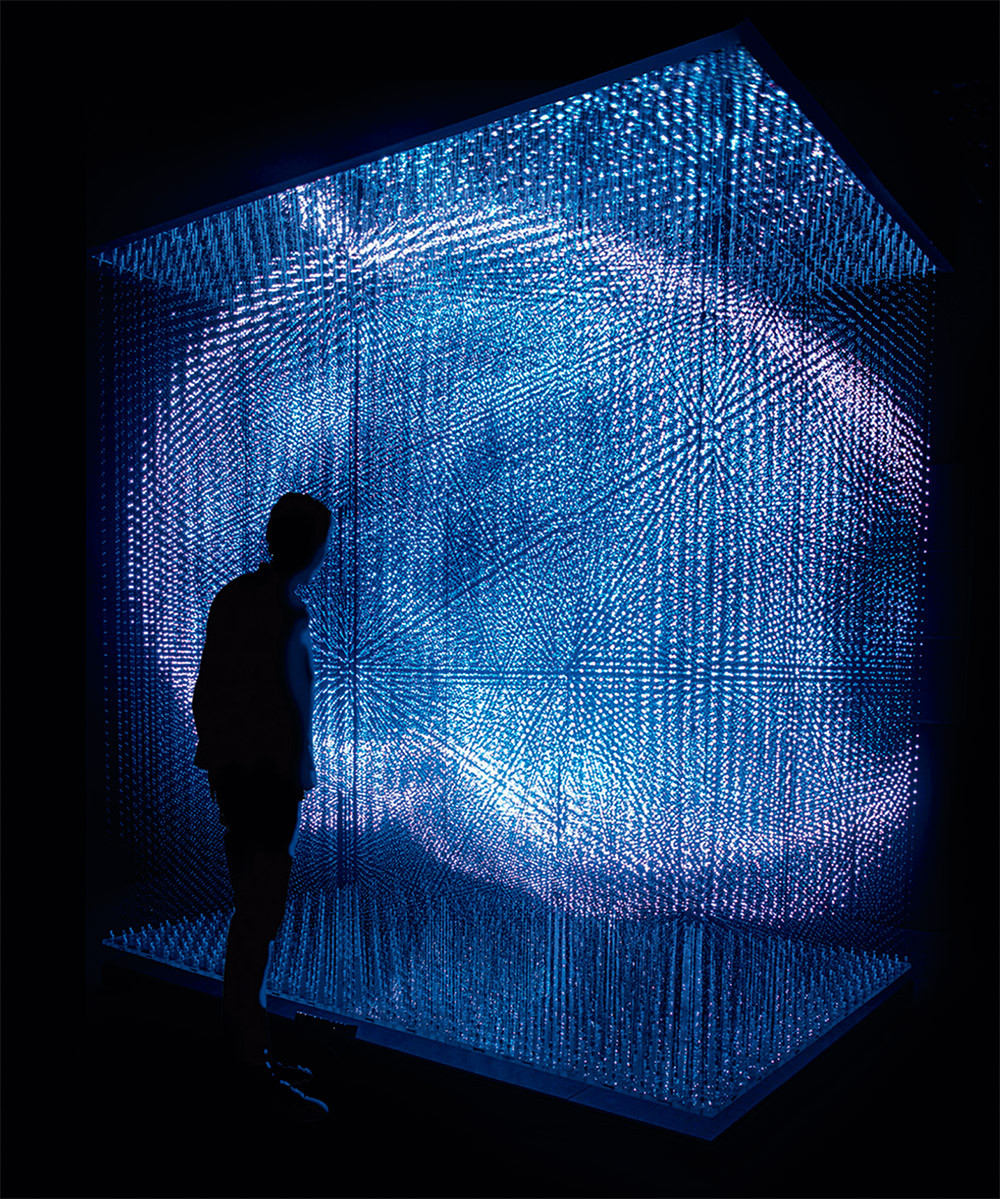 Как спроецировать пространственное объемное 3D-изображение, голограмму, буквально висящую в воздухе? Ученые размышляют над этим уже давно. А вот компания LED Pulse, созданная испанцем Данило Гранде, нашла подход к решению проблемы. Кубический объем заполняется тонкими (0,8 мм), почти невидимыми на расстоянии свисающими сверху нитями-проводами, на которые как бусинки нанизаны крошечные светодиоды. По проводам к каждому из этих источников света подводятся питание и управляющие данные. Объемные пиксели (воксели), то зажигаясь, то угасая, формируют объемную движущуюся картинку. Ее разрешение пока не впечатляет, но кто-то же должен сделать первый шаг.