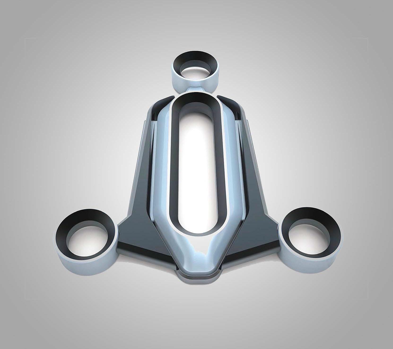 Все помнят безлопастной вентилятор Дайсона? В нем воздух, нагнетаемый спрятанным внутри устройства импеллером, выдувался наружу через узкую кольцеобразную щель. В результате получался стабильный (в отличие от стандартных вентиляторов) кольцеобразный в сечении поток воздуха, при этом сам аппарат практически не издавал шума. А что если такие устройства использовать в качестве реактивных двигателей для дрона? Идею реализовал в своем (пока виртуальном) проекте мексиканский дизайнер Эдгар Эррера. Его безлопастной дрон оснащен четырьмя вентиляторами типа дайсоновских – одним большим в центре летательного аппарата (он отвечает за взлет и посадку) и тремя поменьше, которые обеспечат маневрирование и горизонтальное перемещение. За свою концепцию Эррера получил престижную дизайнерскую премию Red Dot.
