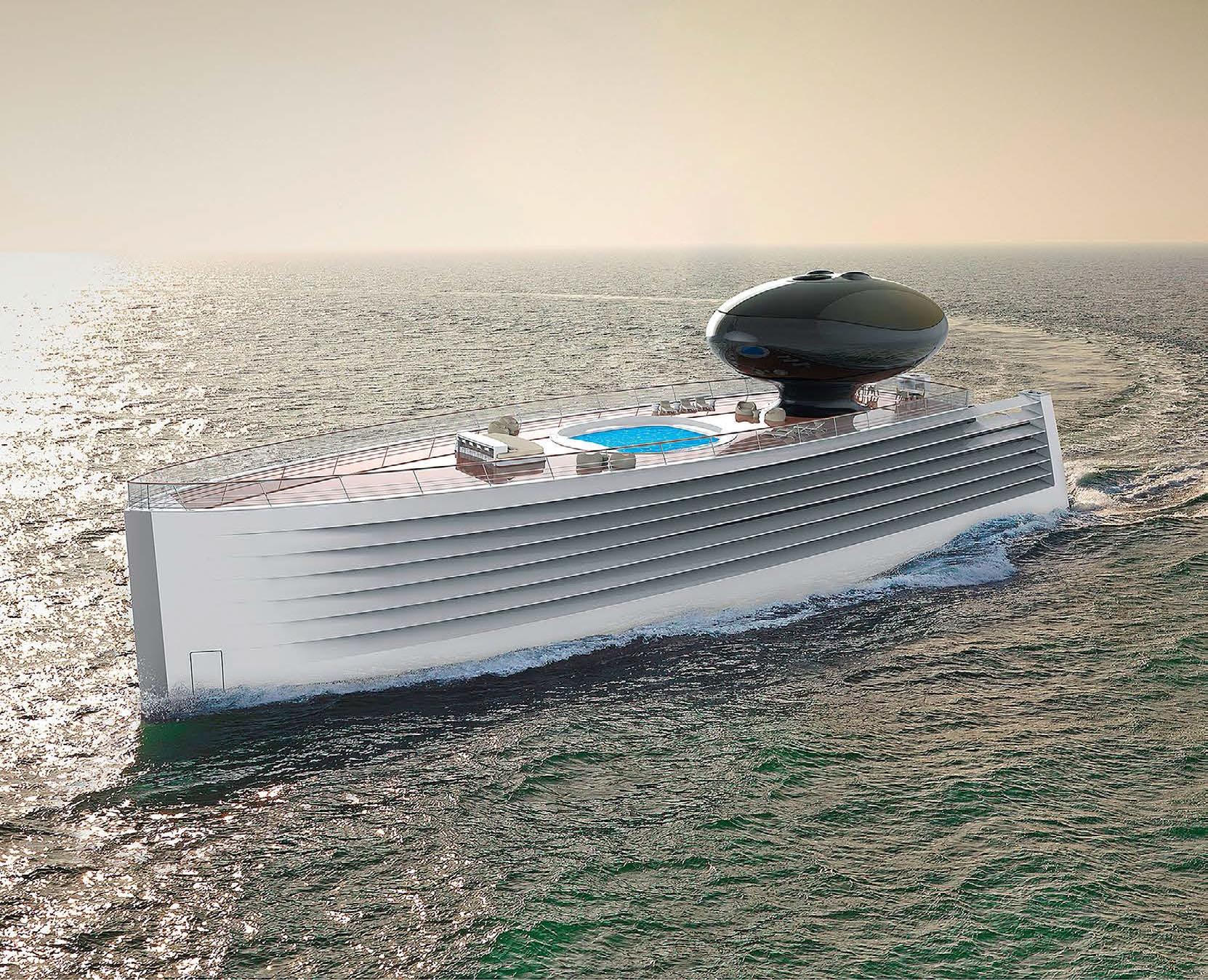 Дизайнер из Амстердама Франк Тьепкема придумал электрическую яхту EAU и нарисовал ее. Почему электрическую? Потому, считает автор, что если мир движется в направлении электромобилизации, значит, вскоре будут созданы более компактные и емкие аккумуляторы электроэнергии и получат широкое распространение пункты подзарядки. Исключительно на электрической тяге судно сможет развивать скорость до 25 узлов. Внутри алюминиевого корпуса расположатся 12 кают и все необходимые для роскошного вояжа службы и помещения. Вероятно, чтобы придать своей работе особенно футуристический вид, Тьепкема спроектировал рулевую рубку в виде каплевидной надстройки над верхней палубой. Концепт голландца номинирован на престижную премию International Yacht and Aviation Awards за 2018 год.