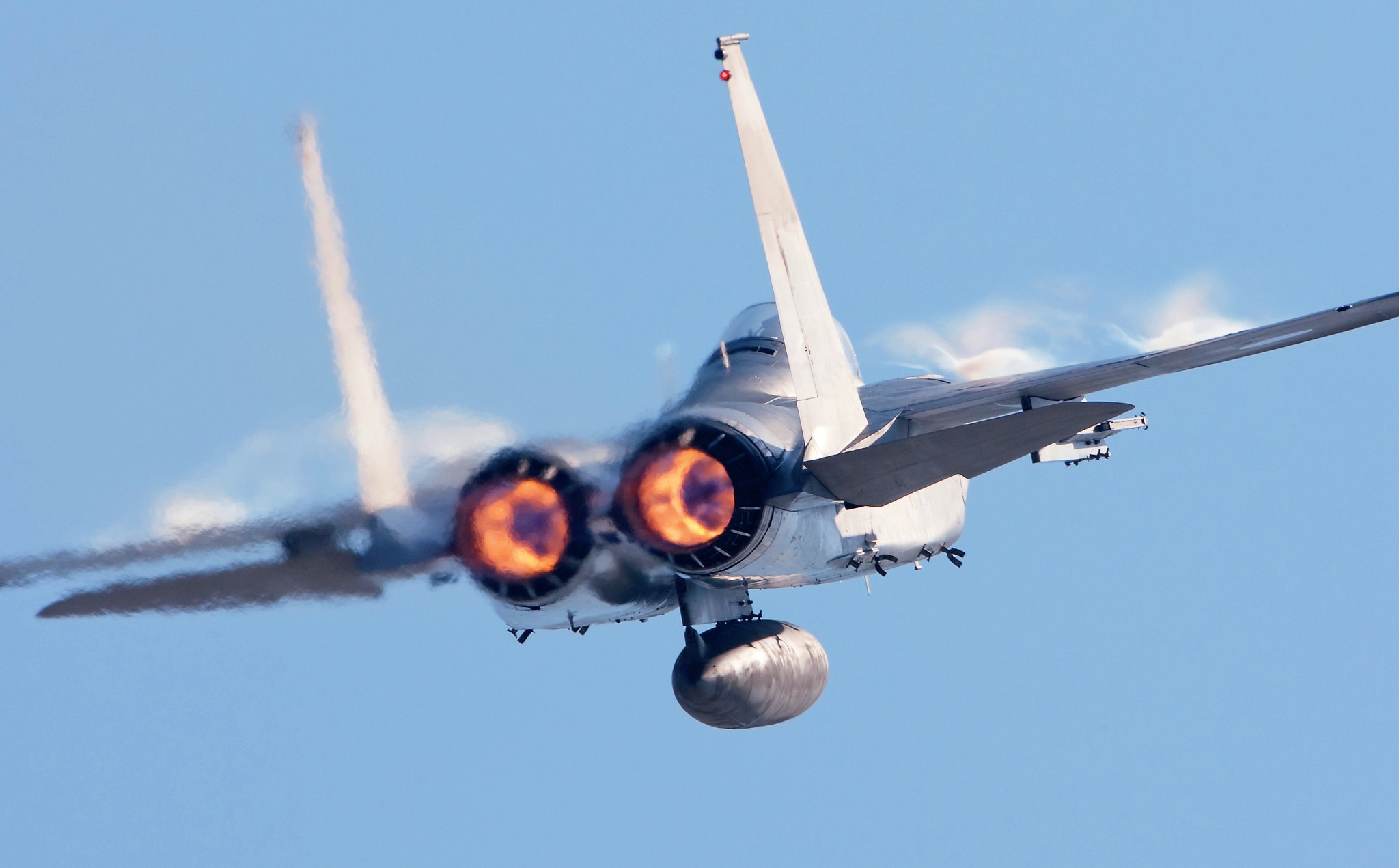 Задрав носы и лизнув длинными языками форсажного огня бетонку, пара отрывается от полосы и стремительно поднимается в ночное небо. Грохот удаляется, в небо уходят две звездочки с огненными хвостами. Внезапно они гаснут. Через пару секунд отдаленный грохот резко смолкает. Форсаж выключен. Истребители продолжают набор высоты на максимальном режиме двигателей.