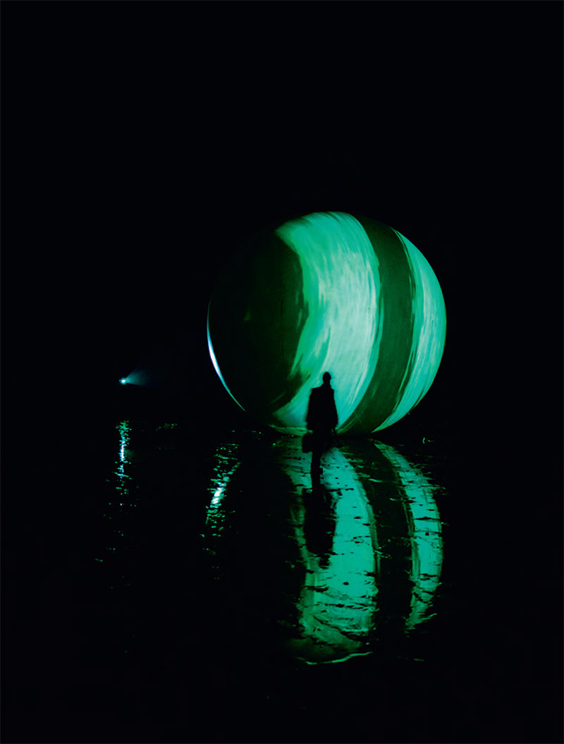 Такой инсталляцией стала 8-метровая сфера, круглый экран для проекции видеоизображения, установленный в литоральной зоне, во время прилива затопляемой водой и осушаемой отливом. «“На границе” – это исследование переходных состояний, – поясняли Хельсон и Джэкетс. – Инсталляция существует лишь временно, на линии суши, которая ненадолго обнажается отливом, на территории, постоянно находящейся в изменении, в переходном пространстве, дезориентирующем и опасном».