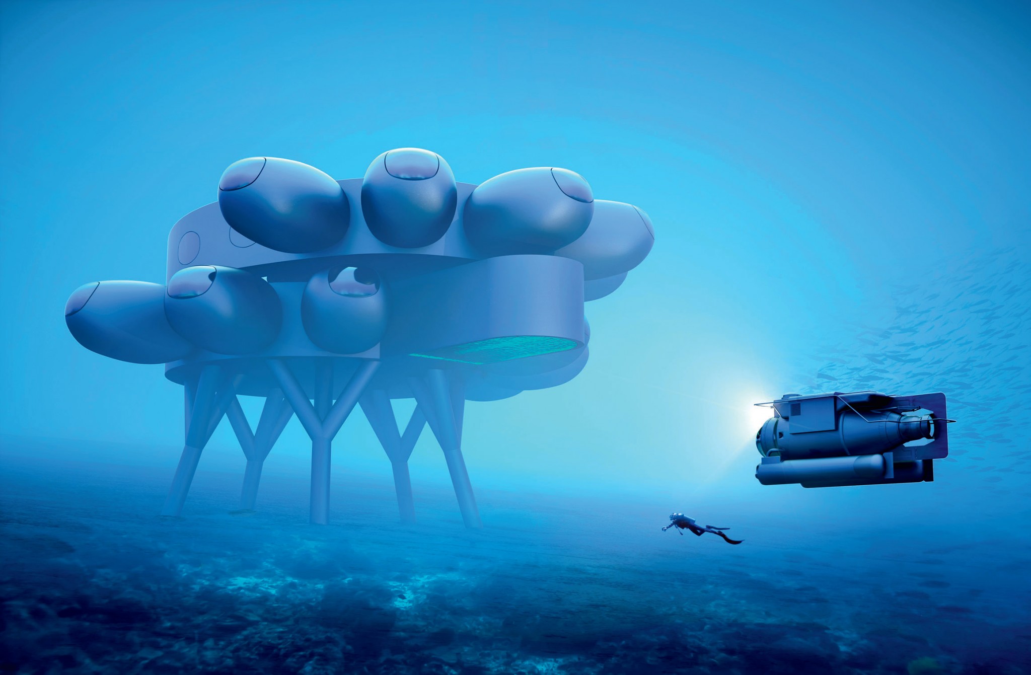 ВНУК ЛЕГЕНДАРНОГО ИССЛЕДОВАТЕЛЯ и покорителя морей Жака Ива Кусто Фабьен продолжает семейное дело и возглавляет собственный центр по изучению и сохранению Мирового океана. Его новый проект – подводная станция, в которой смогут жить и работать до 12 ученых и акванавтов. Герметичное помещение позволит поддерживать внутри повышенное давление и не терять времени на акклиматизацию перед выходом в открытую воду и после него. Облик станции Proteus создан швейцарским дизайнером Ивом Беаром, установить ее планируется в Карибском море, на глубине около 18 м.