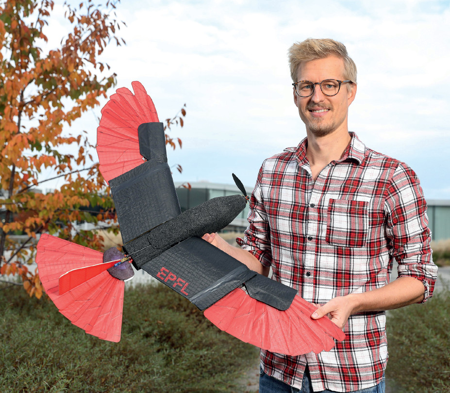 Преимущества и недостатки базовых типов беспилотников хорошо известны. Роторные коптеры отличаются маневренностью, могут взлетать и садиться вертикально, зависать на месте. В отличие от них крылатые аппараты самолетного типа экономичны, грузоподъемны и быстры, но не так устойчивы в полете. Поэтому специалисты из Федеральной политехнической школы Лозанны (EPFL) уже несколько лет прорабатывают схему, которая призвана объединить выгодные стороны обоих вариантов. Кромку крыльев их экспериментального дрона образует ряд подвижных искусственных «перьев». С ними он способен контролировать геометрию и аэродинамику крыла, переходя к полету на разных режимах. А недавно аппарат получил еще и подвижный хвост для большей маневренности.
