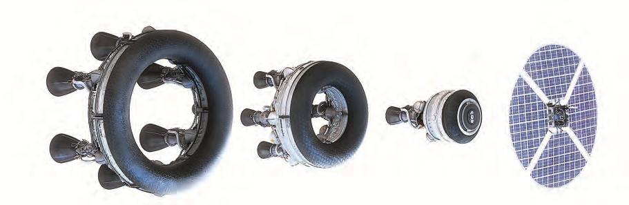 Вторая ступень – еще шесть ЖРД тягой по 2 кН (в вакууме). Ступени в форме торов уменьшающегося диаметра вкладываются одна в другую наподобие матрешки.