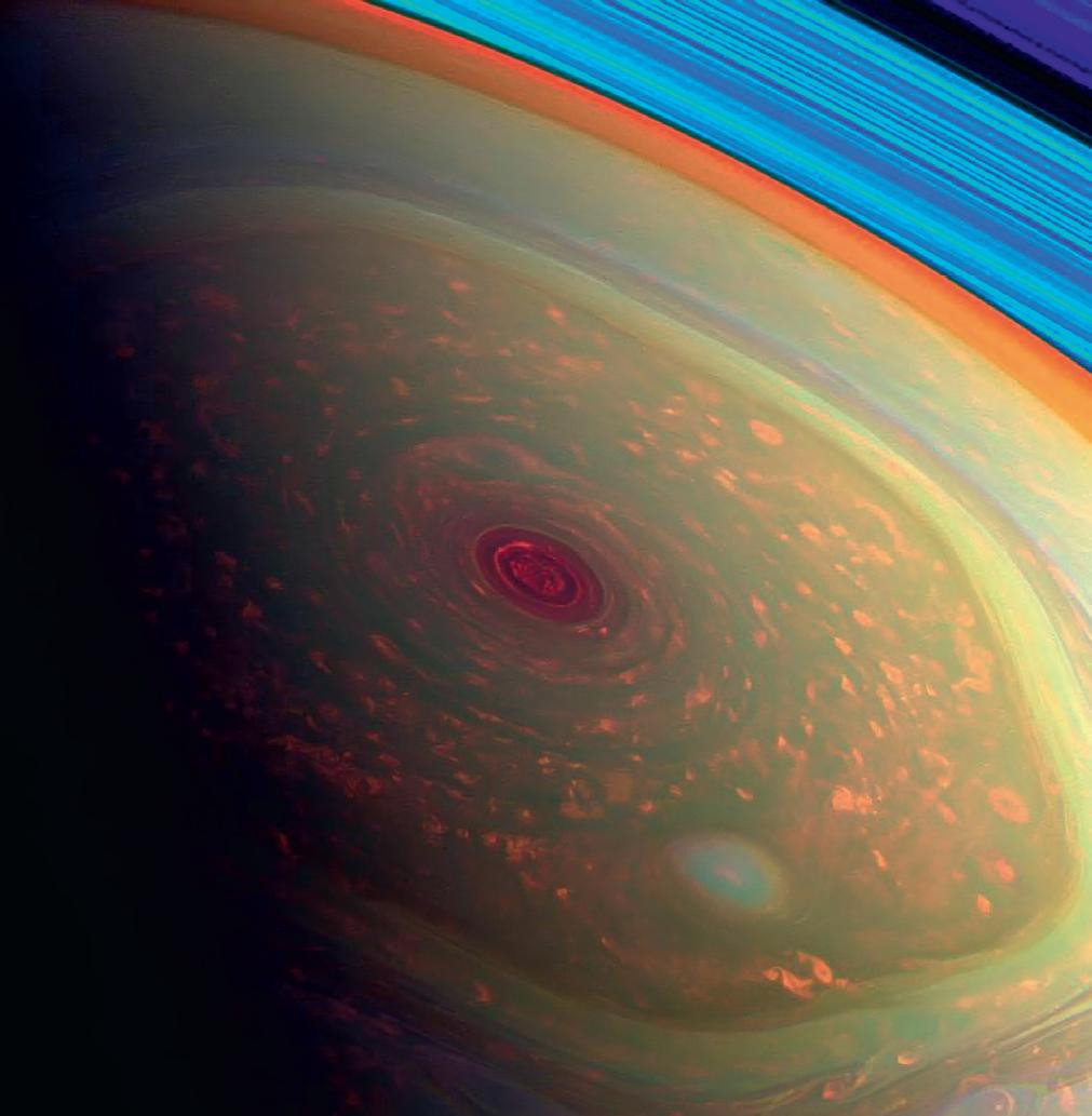 На снимках, сделанных работающим на орбите Сатурна зондом Cassini между 2012 и 2016 годом, хорошо видны сезонные изменения. Год здесь длится почти 30 земных лет, и за это время поздняя весна успела смениться разгаром лета: равноденствие состоялось в 2009 году, а летнее солнцестояние ожидается в мае 2017-го. Поэтому и «гигантский гексагон» – ураган, насчитывающий до 25 000 км в поперечнике и не менее 100 км в высоту – за этот период стал из голубовато-зеленого золотисто-желтым. Астрономы связывают это с накоплением в атмосфере аэрозольных частиц, которые образуются в результате фотохимических реакций под действием относительно яркого летнего Солнца. При этом сам ураган сдерживает доступ этих частиц внутрь, так что оттенок его оказывается чуть более бледным, чем у окружающих облаков в районе северного полюса.