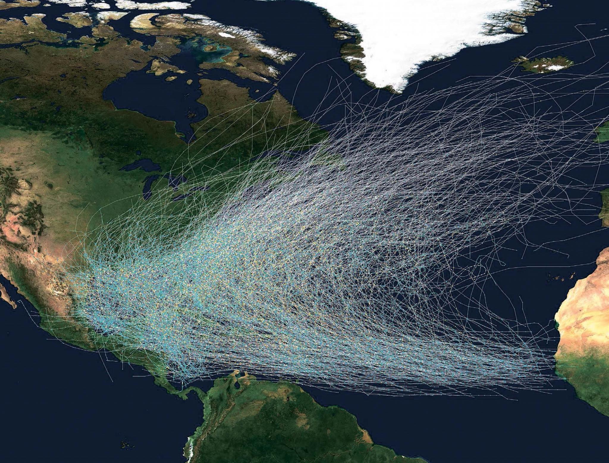 По той же шкале Бофорта полноценный ураган начинается со скорости ветра 30 м/с. Тропический циклон питается испарением теплой воды и над сушей быстро теряет силу. Но пока приток энергии сохраняется, она преобразуется ураганом, как тепловым двигателем, в механическую энергию ветра, в конденсацию водных паров. Сила этого натиска вызывает трепет: самый заурядный тропический циклон (радиус 60 км и скорость 40 м/с), по оценкам американского Национального управления океанических и атмосферных исследований (NOAA), несет примерно 1,5 тераватт кинетической энергии. Конденсация воды в тучи и капли дождя отнимает около 600 ТВт – эта цифра на порядки больше всех текущих потребностей человечества.