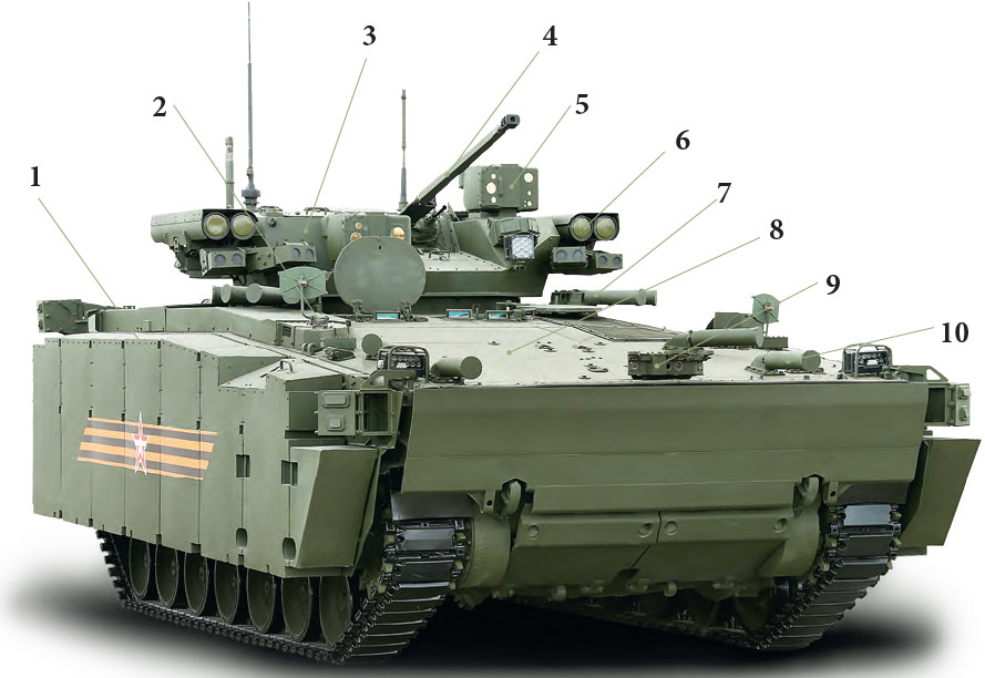 Поэтому масса новых бронемашин семейства «Курганец-25» – это самый важный параметр: именно он определяет возможность наделения их броней, обеспечивающей противоосколочную защиту. А современные снаряды, снаряженные предварительно сформированными поражающими элементами, всякими там стрелками (как в нашем 3Ш2 или американском XM580E1), дают осколки совсем не такие, как артиллерийские гранаты 1940-го. В результате мотострелки обретают защиту от неприцельного огня на уровне экипажей танков, что дает возможность в полной мере воспользоваться преимуществами огневого вала.