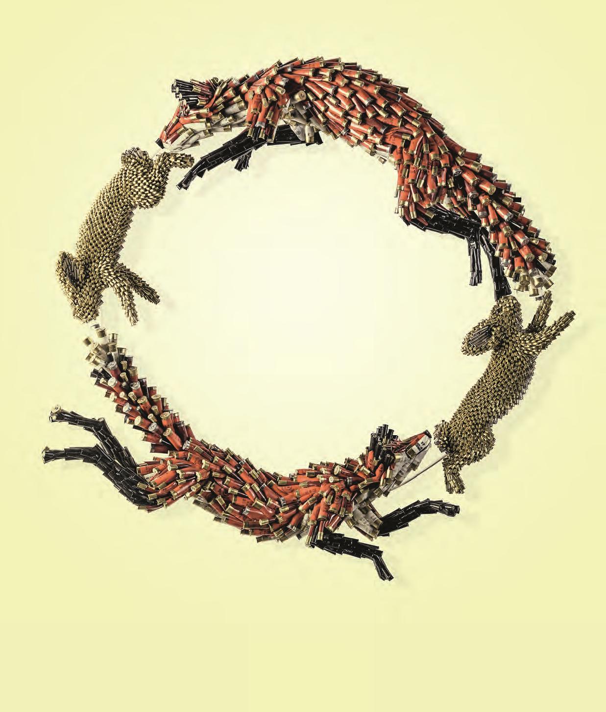 Художник Федерико Урибе родился и вырос в Колумбии – стране, где десятилетиями продолжалась гражданская война, развязанная наркомафией против целого государства. Неудивительно, что самые известные его работы сделаны из стреляных гильз и патронов.