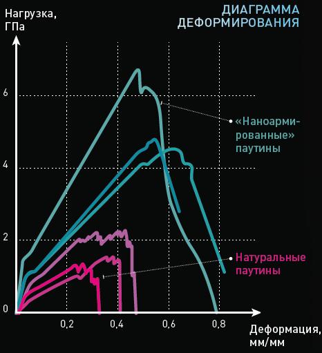 Наличие таких «легирующих» соединений не редкость для природных полимеров. Включения металлов укрепляют челюсти некоторых насекомых, а минеральные кристаллы делают зубы брюхоногих морских блюдечек самым прочным из всех природных материалов. Неудивительно, что и ученые пытаются улучшить свойства паутины внесением искусственных добавок – наночастиц, углеродных нанотрубок и даже полупроводниковых микрокристаллов теллурида кадмия, покрытие из которых заставило паутину флуоресцировать. Как правило, их просто напыляют на нить. Внедрить частицы в ее структуру не удавалось, пока итальянско-британский физик Никола Пуньо не опрыскал животных водой с графеновыми хлопьями и нанотрубками.