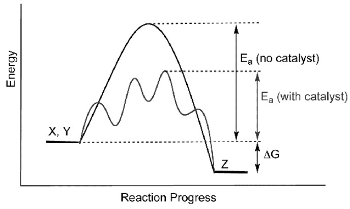Катализатор реагирует с исходными веществами и превращается в промежуточные соединения. Если он подобран правильно, энергетические барьеры между промежуточными соединениями оказываются ниже, чем в некаталитическом процессе, и реакция идет быстрее. Бывает, что сам по себе энергетический барьер очень высок, и в норме вещества вообще не реагируют друг с другом, но в присутствии катализатора реакция происходит за считанные минуты. При этом в зависимости от катализатора, из одних и тех же исходных веществ могут получаться разные продукты — просто потому, что каждый катализатор по-своему влияет на переходные состояния разных реакций. Например, из смеси двух алкенов с помощью катализатора Циглера — Натта (тетрахлорида титана в смеси с триэтилалюминием) можно получить полимер, а с помощью катализатора Граббса (карбенового комплекса рутения) — продукт реакции метатезиса.