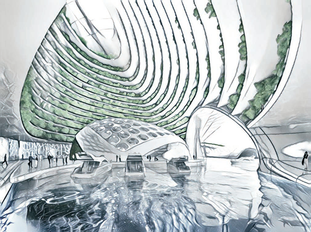 The project author’s concept envisages people travelling in ships and submarines powered by biofuel. Energy and food will be provided by algae, plankton, and shellfish, which are planned to grow on the island.