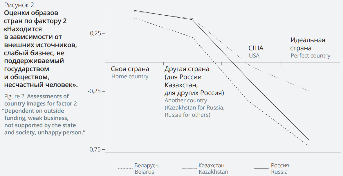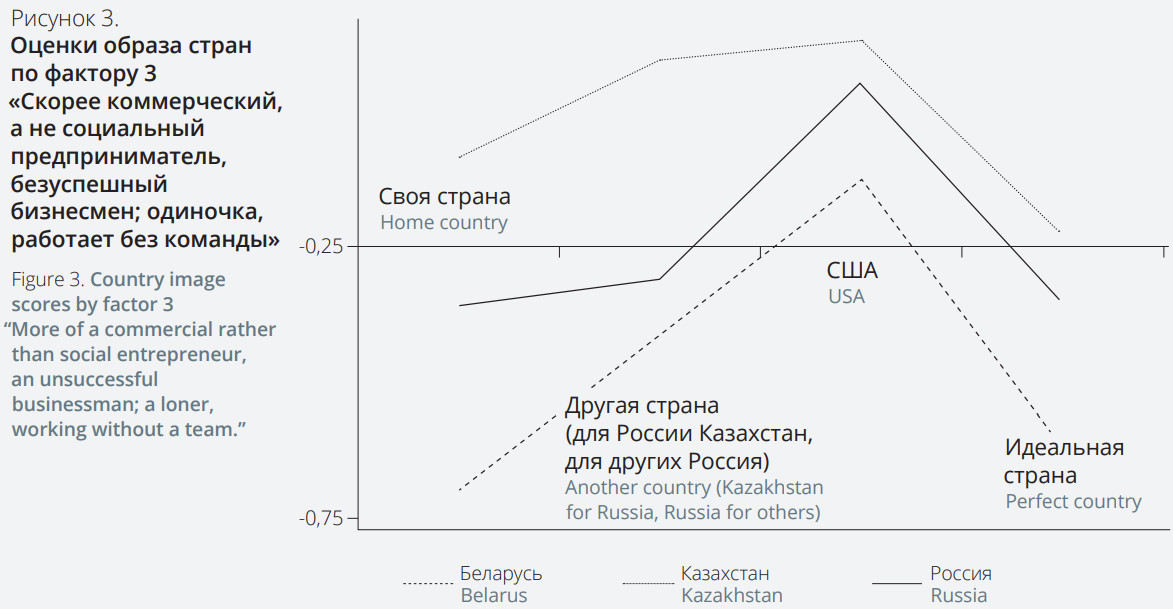 Еще одна тенденция, которая была найдена для фактора 2 — это сходство в оценках респондентов образа социального предпринимателя в собственных странах и в отношении «другой страны» (Россия для Беларуси и Казахстана, а Казахстан — для России). В целом, мы можем охарактеризовать эти образы как не имеющие существенных различий (См. Рисунок 3).