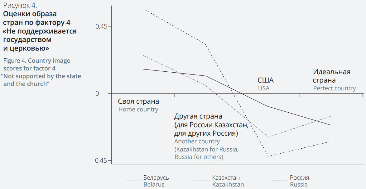 Что касается оценок «идеальной страны», то более существенное различие здесь между ответами респондентов из Беларуси в сравнении с ответами представителей других стран Казахстана (р = 0,006) и России (р = 0,048) (См. Рисунок 4).