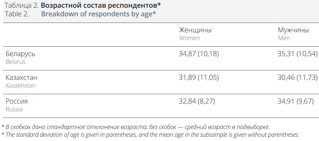 Респондентами исследования стали участники конкурса SAP UP 2017 года. Заполнение исследовательского бланка было частью процесса подачи заявки на участие в конкурсе. И, исходя из полученных ответов, можно сказать, что все респонденты идентифицируют себя в качестве социальных предпринимателей. Размер выборки составил 323 респондента: 105 из Беларуси, 91 из Казахстана и 127 из России.