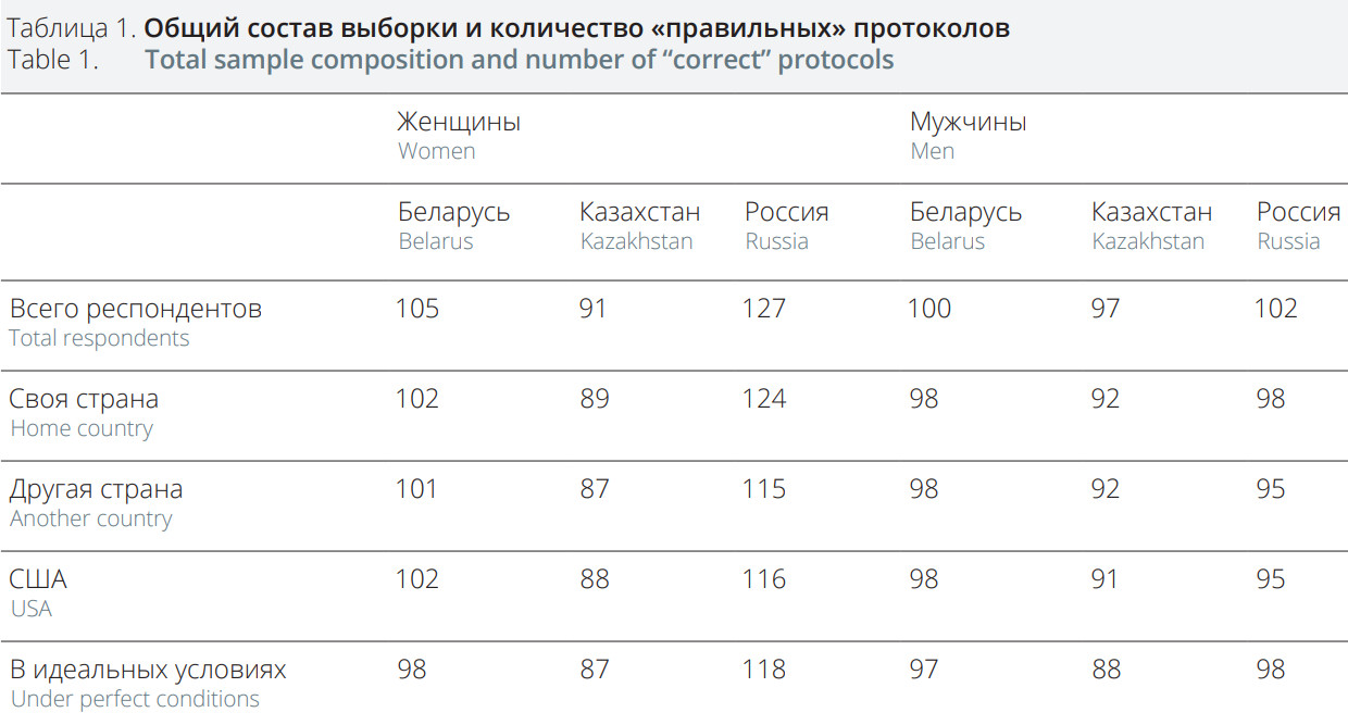 Из общего числа протоколов для каждой из стран (см. Таблицу 1), были исключены те, в которых респонденты использовали одну категорию ответа в более чем 90% случаев. Другими словами, если респондент оценивает один объект на 38 баллов, и оставшиеся 4 балла распределяет между другими категориями, то такие анкеты исключаются из исследования. В таблице 1 показано количество «правильных» протоколов для каждого образца в каждой стране.
