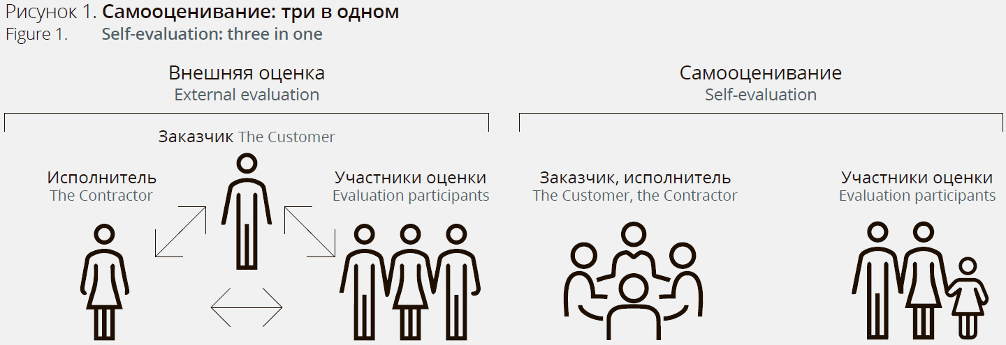 Самооценивание программы (проекта) — это систематический сбор информации о деятельности в рамках программы (проекта), ее характеристиках и результатах, который проводится командой программы (проекта) для того, чтобы вынести суждение о программе (проекте), повысить эффективность программы (проекта) и/или разработать планы на будущее. Отличие этого определения от общего обозначения оценки, приведенного в начале статьи, выделено курсивом: здесь все делает сама команда проекта. Люди, реализующие проект, сами ставят задачу на проведение оценки, сами планируют проведение оценки, сами собирают данные (будучи при этом еще и важными источниками информации), сами анализируют эти данные, формулируют результаты оценки и используют их. Получается, что при самооценивании команда проекта является и заказчиком, и исполнителем, и участником оценки (см. Рис. 1).