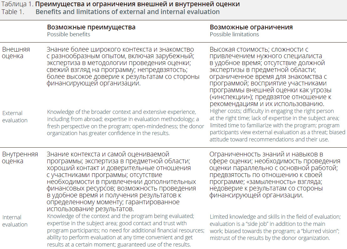 Не вдаваясь в исторические детали, отметим, что, в России всё началось с внешней оценки, которую «импортировали» к нам в начале 90-х вместе с программами международной помощи многочисленные зарубежные организации (Kuzmin et al., 2007). Постепенно оценку стали осваивать и российские специалисты. При этом развитие оценки шло по двум направлениям: формировался рынок услуг по проведению внешней оценки и развивалась функция внутренней оценки.