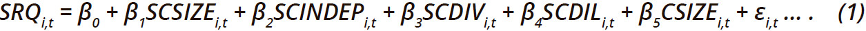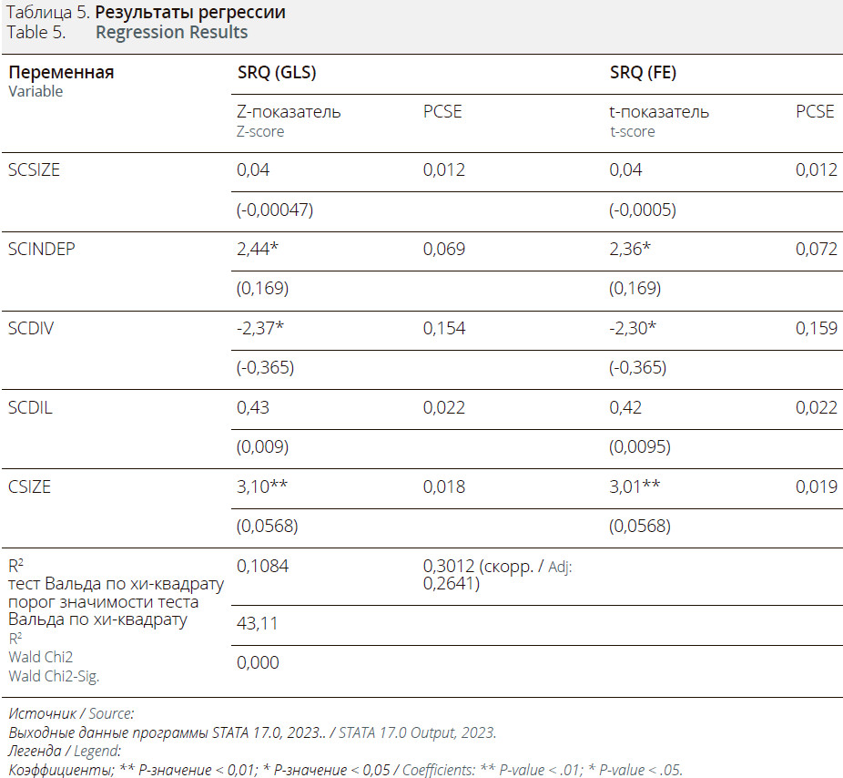 В Таблицах 2 и 3 представлена описательная и корреляционная статистика соответственно, для переменных, изучаемых в данном исследовании: SRQ, SCSIZE, SCINDEP, SCDIV, SCDIL и CSIZE.