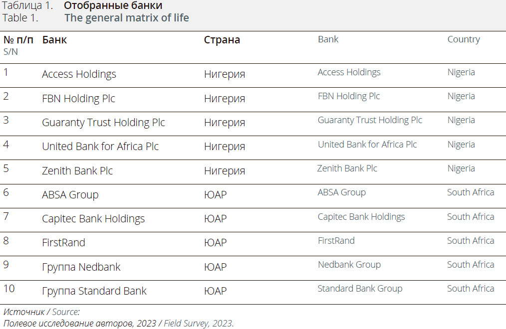 Исследование охватывает 10-летний период с 2012 по 2021 год. Это был период значительных изменений в стандартах и правилах отчетности в области устойчивого развития, а также изменений в бизнес-среде в Нигерии и ЮАР. В качестве объекта исследования выступают все нижеперечисленные банки, работающие в Нигерии и ЮАР. В исследовании использовалась целевая выборка с фокусом на банках, имеющих комитеты по устойчивому развитию. В Таблице 1 приведен список банков.