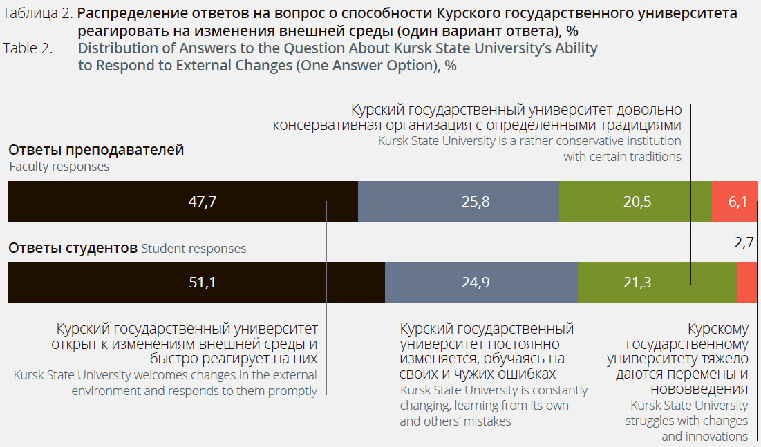 The essence of the university’s organizational culture is largely shaped by its capacity to adapt to external shifts and fluctuations. To gauge the extent to which this attribute resonates with Kursk State University, let’s turn to the insights presented in Table 2.