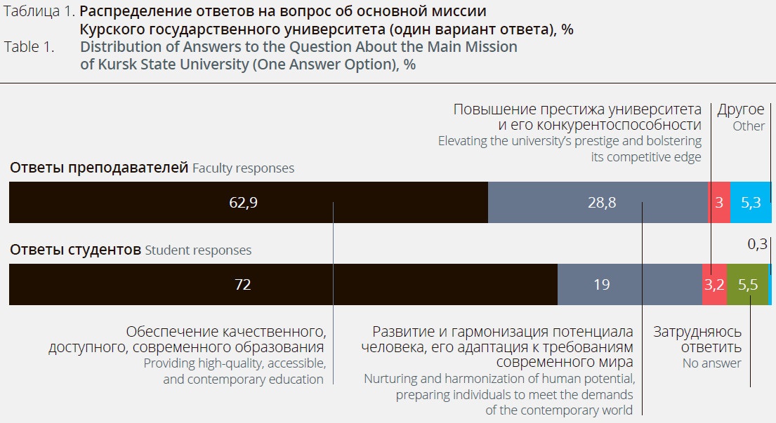 Of paramount significance was the question about the university’s mission, as it serves to unveil the wide range of perceptions regarding the organization’s purpose and societal role. It is noteworthy that an overwhelming majority of the respondents perceive Kursk State University’s mission as centered on providing high-quality, accessible, and contemporary education. One in five students, and one in three faculty members, see this mission as the nurturing and harmonization of human potential, preparing individuals to meet the demands of the contemporary world. A smaller portion of students (3.2%) and faculty members (3%) view the mission through the lens of elevating the university’s prestige and bolstering its competitive edge (Table 1).