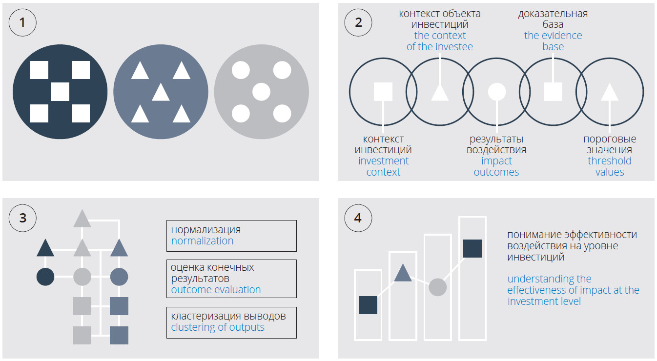 - Строгость. Методология должна генерировать статистически обоснованные, учитывающие контекст выводы о положительных и отрицательных социальных и экологических результатах, связанных с инвестициями воздействия.