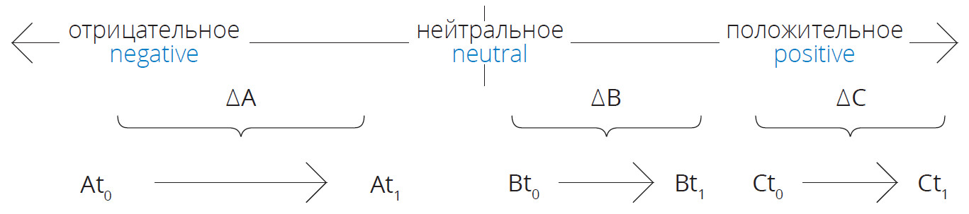 Рассмотрим три проекта: А, В, С. К определенному моменту времени t1 по каждому проекту достигнуты результаты At1, Bt1, Ct1. Пусть соотношение результатов будет таким, как показано на рисунке выше, где At0, Bt0, Ct0 — значения показателей на момент старта проектов. Мы видим, что Bt1 больше, чем At1, но меньше, чем Ct1, и на уровне запасов это указывает на больший потенциал проекта С. Однако если мы оценим потоки или изменения показателей, то увидим другое относительное положение вещей: ΔB больше, чем ΔC, но меньше, чем ΔA. Это значит, что проект А имеет больший эффект воздействия на свой показатель с течением времени. Это также позволяет оценить направленность результатов: хотя At1 остается отрицательным, ΔA указывает на положительное воздействие, учитывая, что At1 движется в положительном направлении относительно At0. Например, выбросы парниковых газов являются негативным воздействием, но сокращение этих выбросов представляет собой положительный результат. Обратную ситуацию мы видим по результату проекта С: его поток отрицательно направлен, значит, следует ожидать снижения показателя с течением времени.
