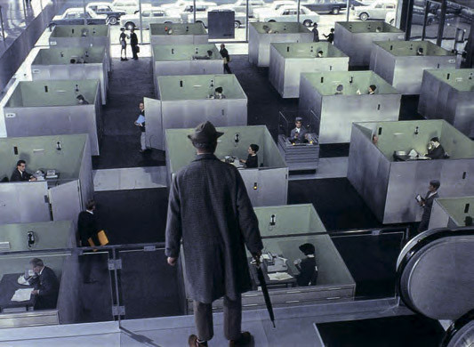 Наиболее известный образ Жака Тати в кино – господин Юло. Из фильмов «Каникулы господина Юло» и «Мой дядюшка» этот персонаж перекочевал в самый амбициозный и дорогостоящий проект Тати «Время развлечений». Главный герой приезжает в Париж на важную встречу, но за весь фильм так и не видит ни одной достопримечательности. Задумка Тати состояла именно в этом: показать стерильность современного обезличенного города с типовой архитектурой. Чтобы воплотить свою идею, режиссер потратил колоссальный бюджет на декорации. Он построил целый город из гигантских небоскребов и по несколько дней ждал необходимого для кадра освещения. Картина сделана в серых тонах с обилием стекла, металла и прямых линий, на фоне которых человек выглядит потерянным.