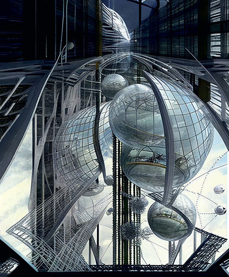 «…Вдали, между двух железных игол, стоял дом-пленка. 1000 стеклянных жилищ, соединяемых висячей тележкой с башнями, блестели стеклом. Там жили художники, любуясь двойным видом на море, так как дом иглой-башней выдвинулся к морю. Он был прекрасен по вечерам. Рядом на недосягаемую высоту вился дом-цветок, с красновато-матовым стеклом купола, кружевом изгороди чашки и стройным железом лестниц ножки. Здесь жили И и Э. Железные иголки дома-пленки и полотно стеклянных сот озарялись закатом. У угловой башни начинался другой, протянутый в поперечном направлении дом. Два дома-волоса вились рядом один около другого. Там дом-шахматы; я задумался. Роща стеклянных тополей сторожила море. Между тем четыре «Чайки № 11» несли по воздуху сеть, в которой сидели купальщики, и положили ее на море…»