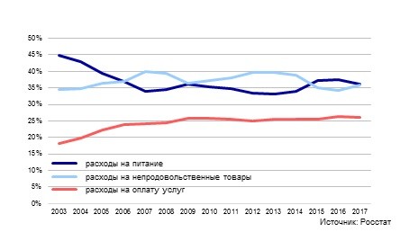 Потребительская активность в России остается слабой. Розничный товарооборот по итогам 2018 года оказался ниже докризисного уровня на 10,8%. Снижение покупательной способности после 2014 года было настолько сильным, что в 2015-2017 годах впервые за десять лет расходы на питание населения превышали затраты на непродовольственные товары. В предыдущие периоды потребительского бума (2000-2008 и 2010-2014 годы) именно рост потребления непродовольственных товаров был основным драйвером увеличения потребительской активности в целом.