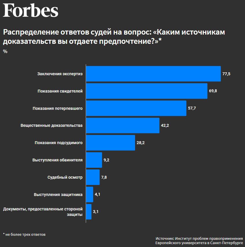 В российских судах по уголовным делам заключение эксперта является крайне значимым доказательством. Согласно опросу судей, проведенному Институтом проблем правоприменения при Европейском университете в Санкт-Петербурге в 2014 году, почти 80% арбитров, рассматривающих уголовные дела, доверяют как доказательству по делу именно экспертизам, и только 4% готовы полагаться на выступление защиты. С тех пор, как показывает опыт общения авторов с представителями судебной системы, ситуация изменилась мало.